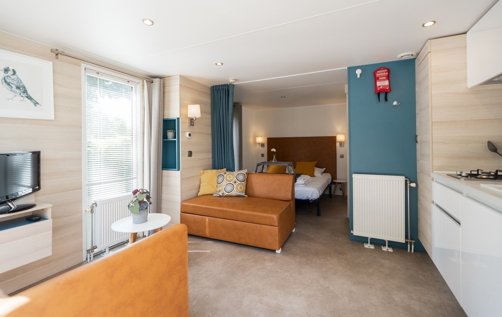 Slapen in een hotelkamer, maar dan met de charme van een vakantiepark. Deze lodge is perfect voor een weekendje Delft met z’n tweeën. Geniet van een knus interieur, een kleine keuken en een terras met comfortabele tuinmeubelen.